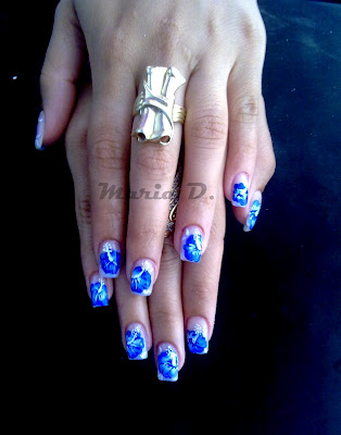 Protectie gel pe unghia naturala, glitter alb-violet si pictura : Hybiscus.