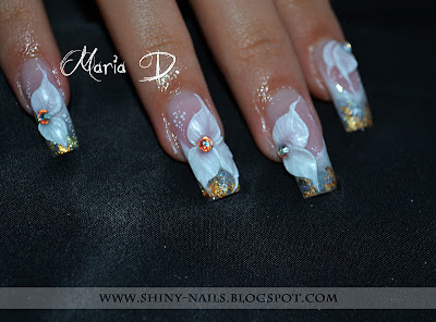 Extensii de unghii cu gel, prelungirea patului unghial cu cover gel natural, french permanent alb pierdut, glitter gel alb, folie aurie. Flori 3D realizate din acryl cu cristale Swarovski si pictura cu vopsele acrilice.